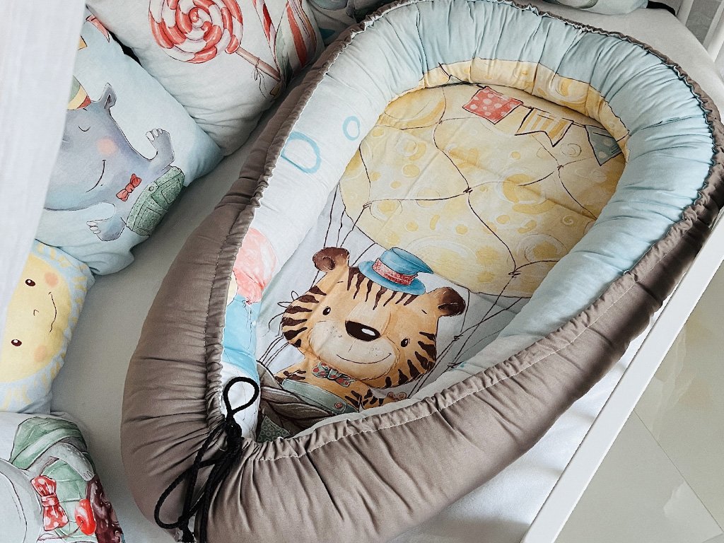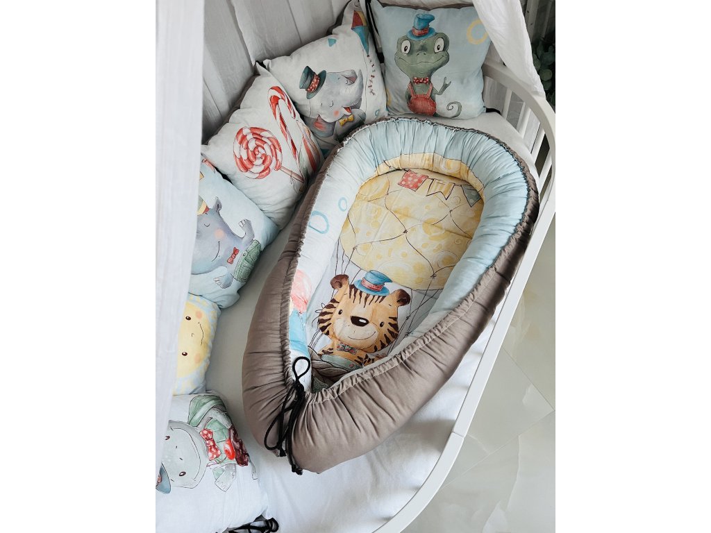 - Polštářkový mantinel: Skládá se ze 6 polštářků o rozměrech 35×35 cm. Každý polštářek je opatřen šňůrkami pro snadné přichycení k jakékoliv postýlce.