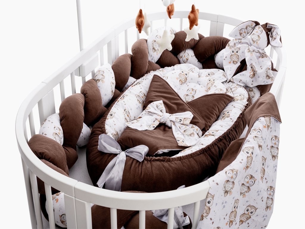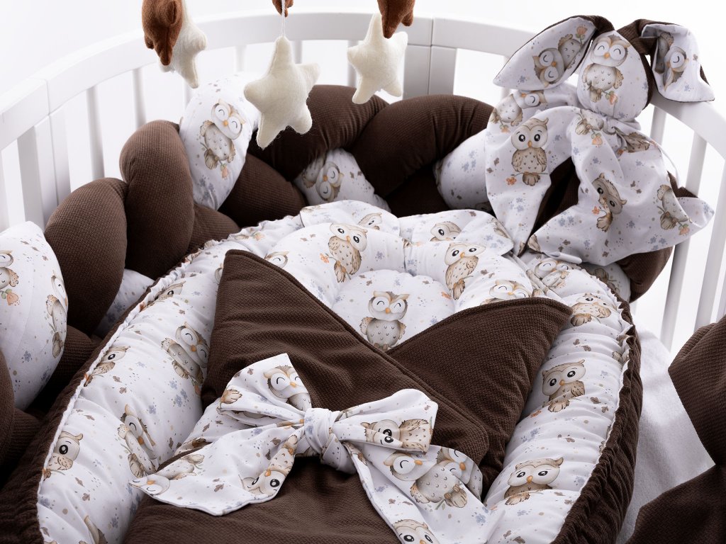 6dílný set do postýlky v kombinaci se sovičkami a kakaovým velvetem.
