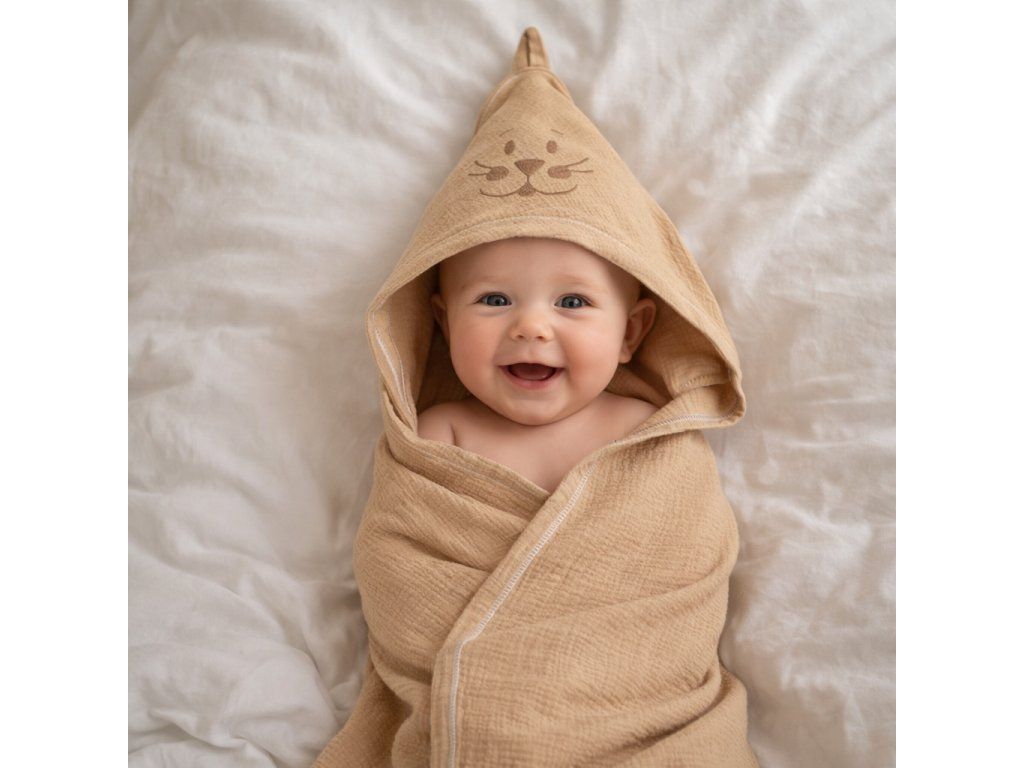 Osuška má rozměr 100 × 100 cm a je určená pro děti přibližně 0–5 let. Kapuce pomáhá udržet hlavičku v teple a osuška díky savému a šetrnému materiálu rychle osuší citlivou dětskou pokožku.