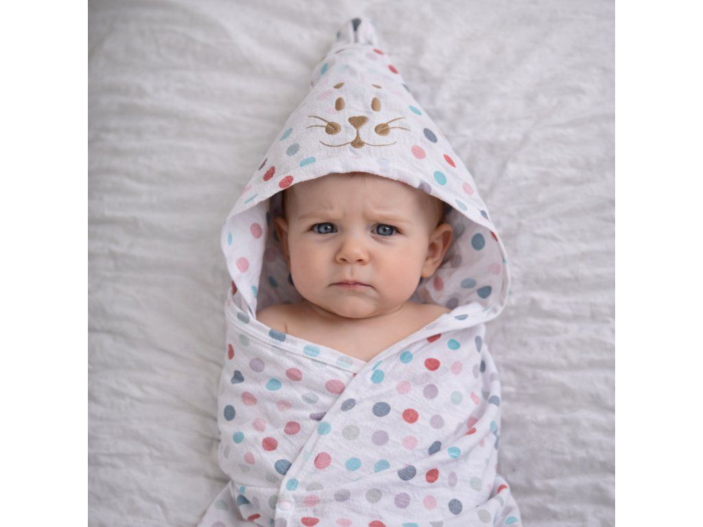 Osuška má rozměr 100 × 100 cm a je určená pro děti přibližně 0–5 let. Kapuce pomáhá udržet hlavičku v teple a osuška díky savému a šetrnému materiálu rychle osuší citlivou dětskou pokožku.