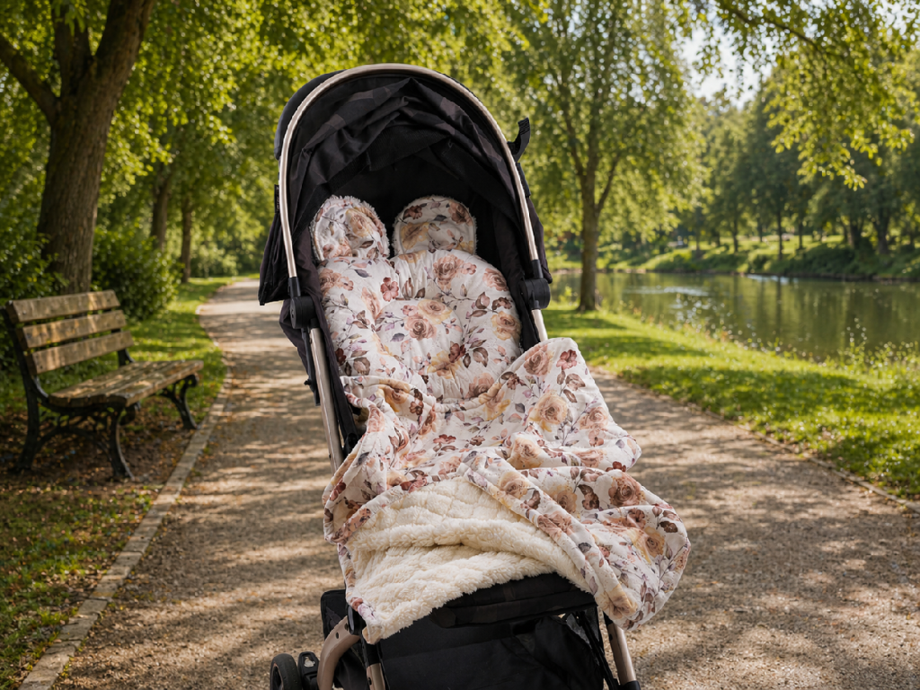 - ✔ Oboustranné provedení – květinová látka + beránek