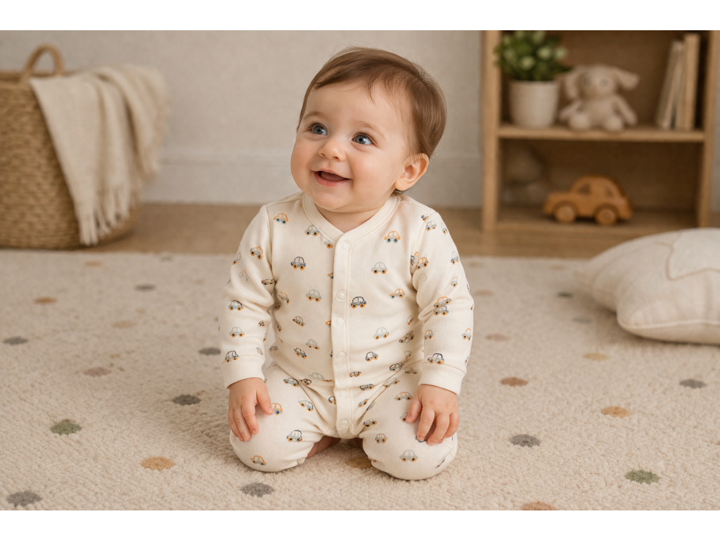 Vyroben ze 100% bavlny, která je jemná, prodyšná a šetrná k citlivé pokožce novorozence. Krémový podklad doplňuje hravý motiv barevných autíček, který si zamilují rodiče i děti.