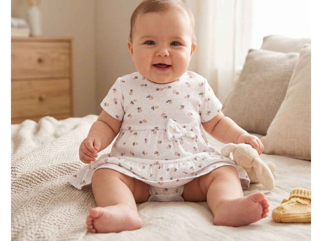 Dopřejte své malé slečně pohodlí i styl s dívčím body se sukénkou Mimoušek® s jemným květinovým motivem. Tento roztomilý kousek spojuje praktičnost body a elegantní vzhled sukénky v jednom.