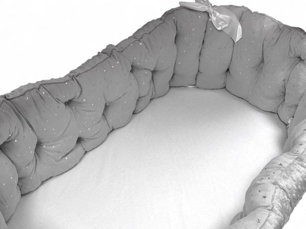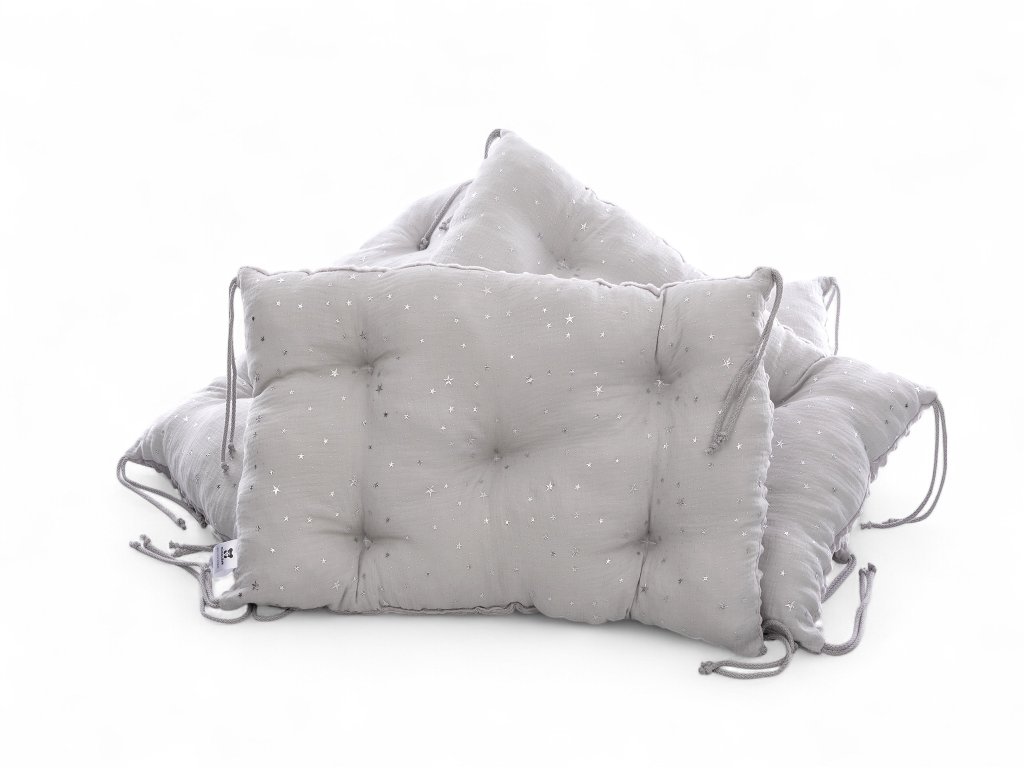 Ručně šitý polštářkový mantinel Mimoušek na míru poskytuje bezpečí a pohodlí pro vaše miminko. Možnost výběru materiálů, barev a počtu polštářků dle vašich představ.