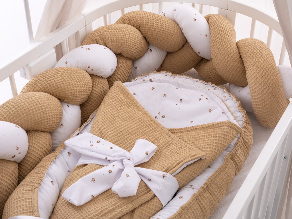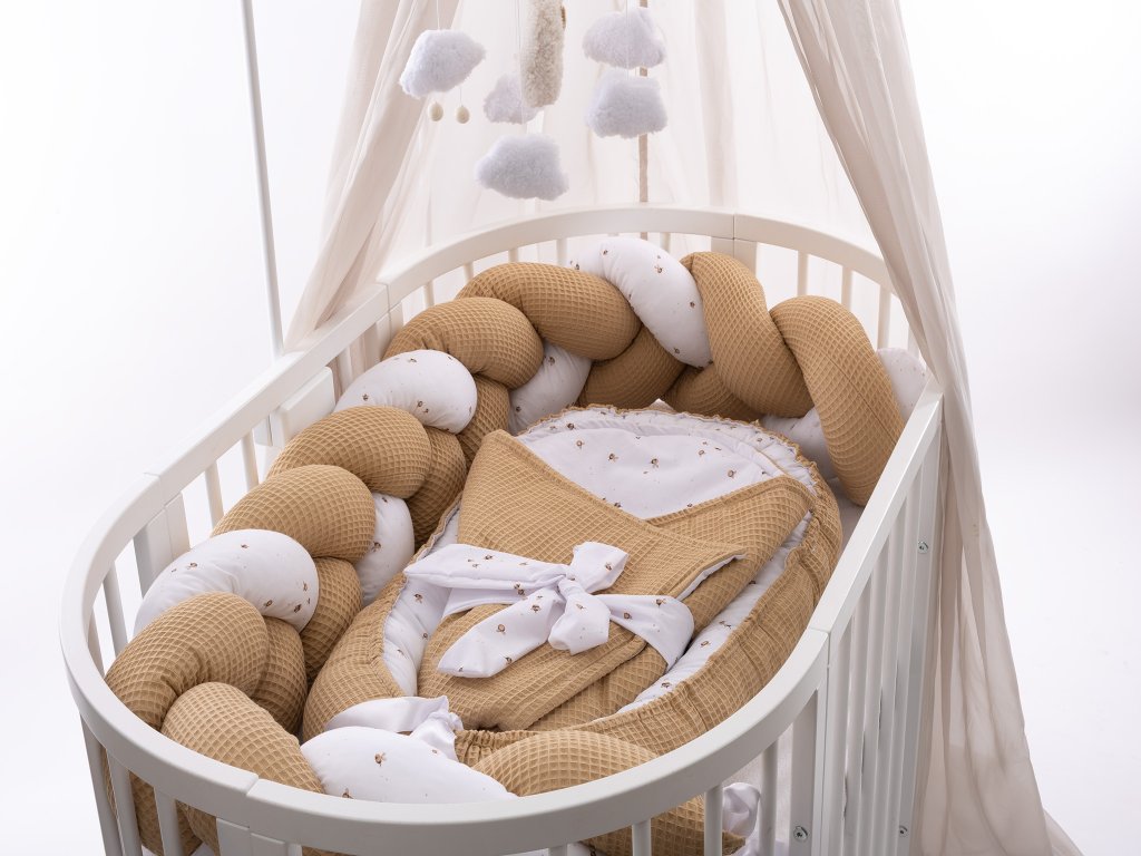 Luxusní 3-dílný set do postýlky z autorského vzoru včeliček a béžové vafle. Ručně šitý v Česku z atestovaných materiálů pro pohodlí a bezpečí vašeho miminka.