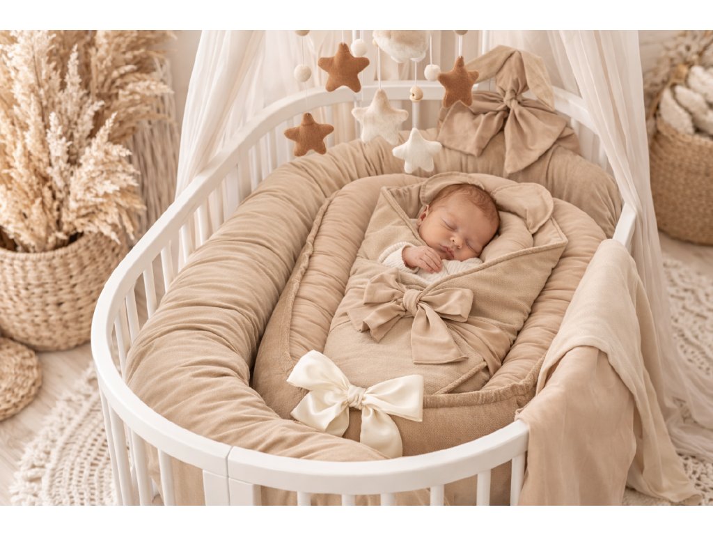 Luxusní 6dílný set v mandlové barvě. Ručně šité z atestovaných materiálů pro maximální pohodlí a bezpečí miminka.