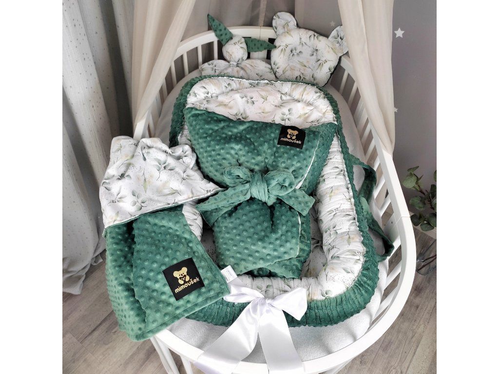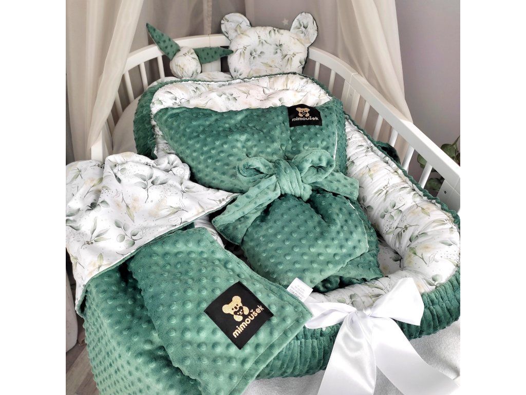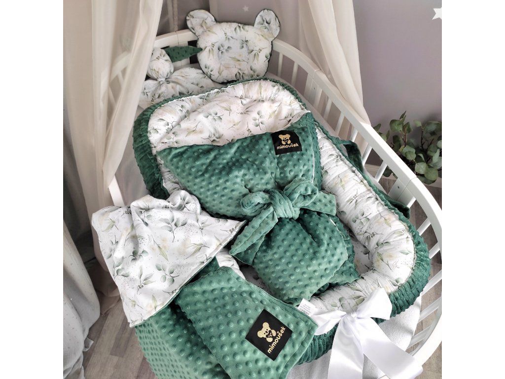 Luxusní 5dílný set do postýlky v kombinaci autorského vzoru eukalyptu a jadeitového minky. Ručně šitý v Česku z atestovaných materiálů pro pohodlí a bezpečí vašeho miminka.