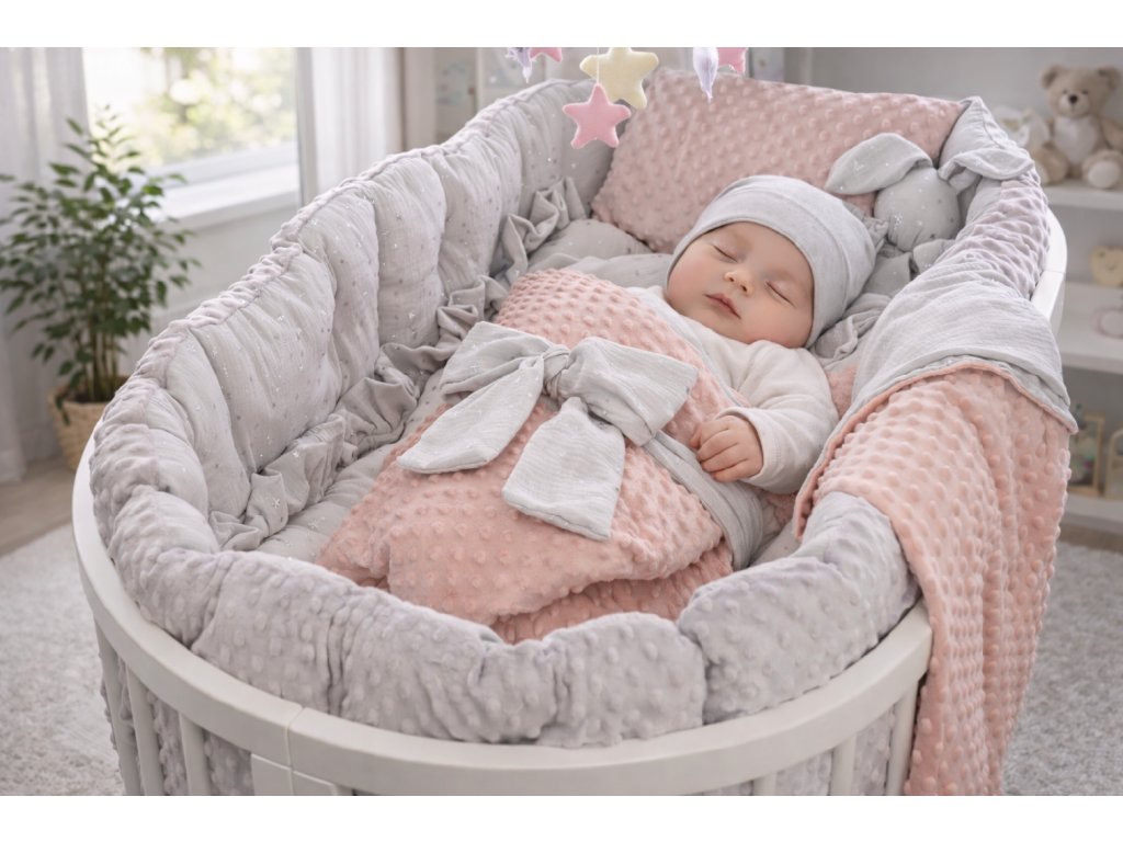 Luxusní 6dílný set do postýlky v kombinaci minky barva sépiová růže a mušelínu v barvě šedý ledovec s hvězdičkami. Ručně šitý v Česku z atestovaných materiálů pro pohodlí a bezpečí vašeho miminka.